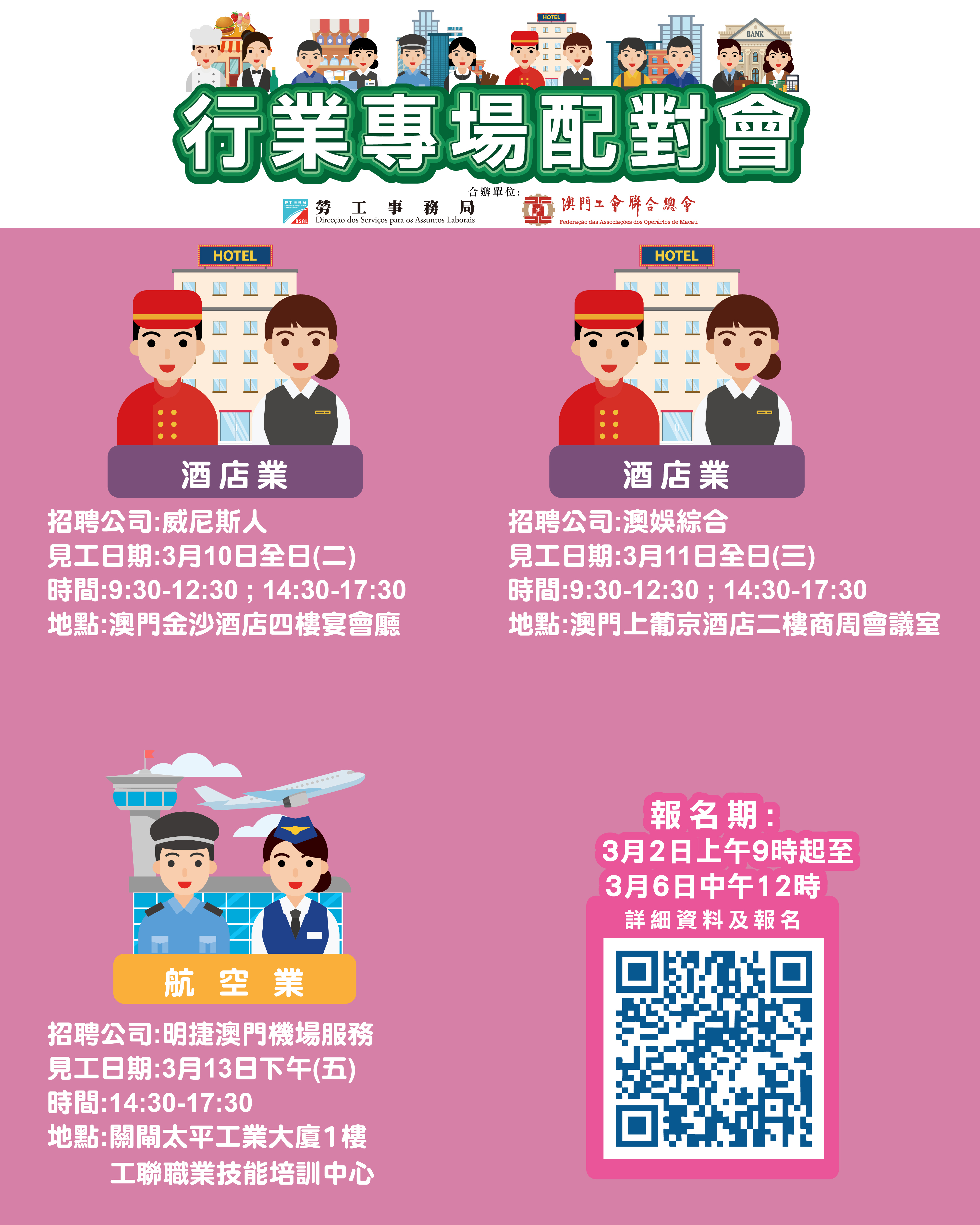 3月10日假澳門金沙酒店四樓宴會廳舉辦酒店業專場配對會,參與企業為“威尼斯人澳門股份有限公司”,提供111個職位空缺,主要職位包括餐飲服務經理、豪華轎車服務部主管、前台部賓客關係專員、專職管家、廚師(中廚/西廚)及餐飲服務員等崗位。