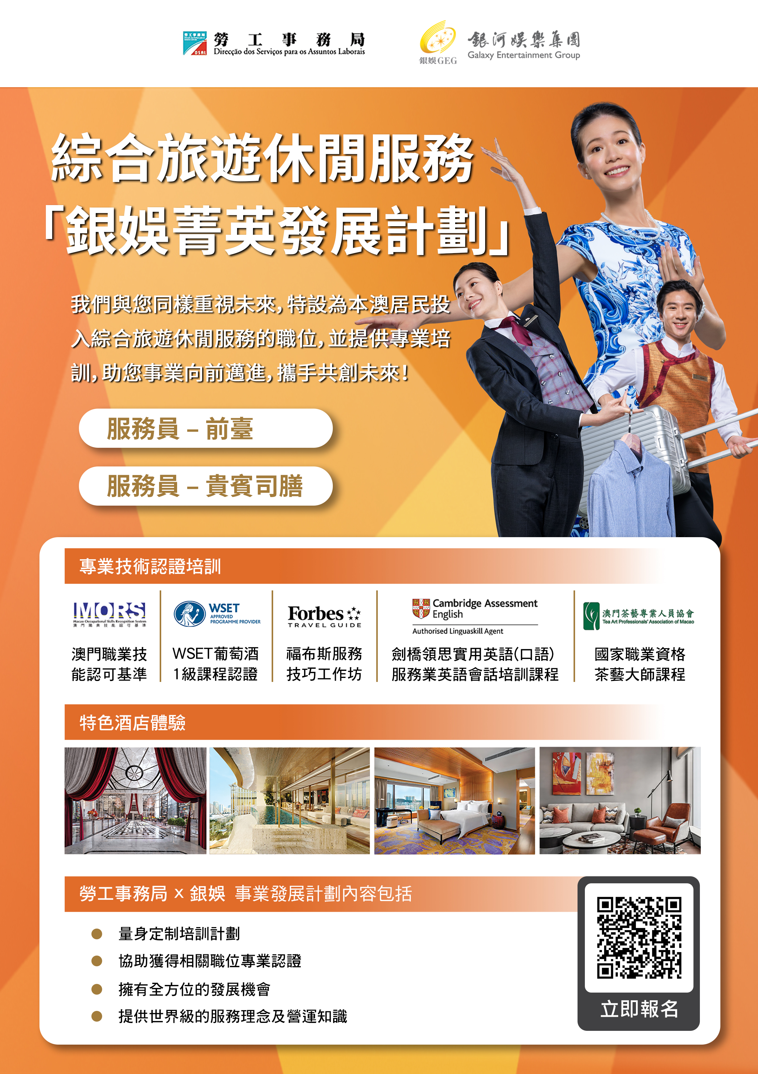 勞工事務局(下稱“勞工局”)與銀河娛樂集團(下稱“銀娛”)合作推出“銀娛菁英發展計劃(酒店營運)”(下稱“計劃”),以“先入職、後培訓”方式,協助本澳居民提升專業技能與促進其職業生涯向上流動,該計劃由明(10)日起接受網上申請。
