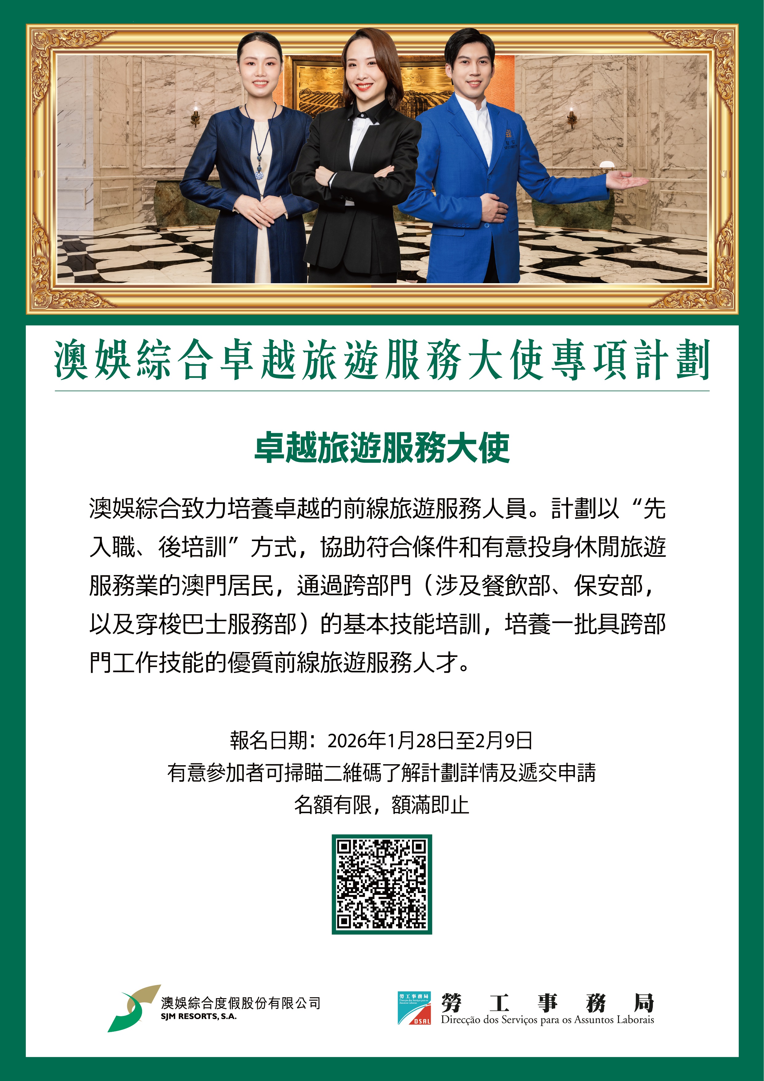 為回應澳門旅遊業急速發展需要,以及應對節假日期間旅客接待工作,澳娛綜合有意培養一批具跨部門工作技能的前線旅遊服務人員,為此,勞工事務局(下稱勞工局)與澳娛綜合度假股份有限公司(下稱澳娛綜合)將合辦“澳娛綜合卓越旅遊服務大使專項計劃”。