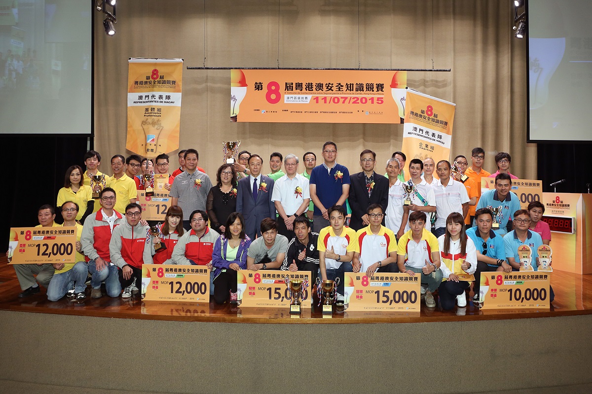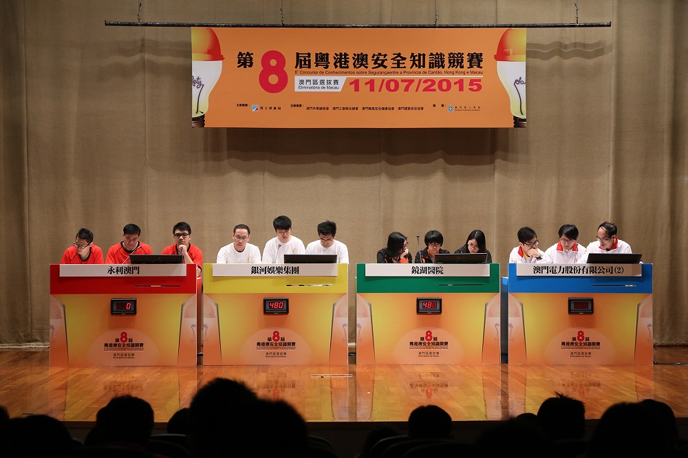 由澳門勞工事務局、廣東省安全生產監督管理局以及香港職業安全健康局合辦的「第八屆粵港澳安全知識競賽」將於今年十一月在廣州舉行。競賽的目的是透過問答比賽,讓在職人士加深認識和掌握有關職業安全與健康的知識,從而預防工作意外和職業病的發生。為了選出代表澳門地區的隊伍參加競賽,勞工事務局已於本年7月11日(星期六),假澳門理工學院大禮堂舉辦「第八屆粵港澳安全知識競賽」澳門地區選拔賽。 比賽設工會/團體組、建築企業組及一般企業組三個組別,比賽以隊制形式進行,每隊各派出三名代表出賽,透過對有關職安健知識的實物操作題、影片題和問答題進行競賽,最後積分最高的一隊成為該組別的優勝隊伍。 競賽內容涉及各行各業及多種工種的職安健知識,包括:職安健法規知識,以及十四項主要的職業安全健康知識,如建造業安全、飲食業安全、辦公室安全、安全管理、工場整理、體力處理操作、職業健康、消防安全、電力安全、化學品安全、燒焊操作安全、機械操作安全及個人防護等。 是次比賽由勞工事務局局長黃志雄、職業安全健康廳廳長林玉章、澳門中華總商會副理事長黃國勝、澳門工會聯合總會副理事長李從正、澳門職業安全健康協會會長高志良及澳門建築安全協會會長李家慈擔任比賽的名譽評判及頒獎嘉賓。比賽結果如下: 工會/團體組 冠軍 :水電工會 亞軍 :新福利職業安全健康職工會 季軍 :澳門建造業總工會 建築企業組 冠軍 :興聯建築(澳門)有限公司 亞軍 :中國建築工程(澳門)有限公司(1)隊 季軍 :得寶建築集團有限公司 一般企業組 冠軍 :澳門電力股份有限公司(1) 隊 亞軍 :永利澳門 季軍 :澳門電訊有限公司(A)隊 三組的冠、亞、季軍隊伍,分別獲頒發獎盃及澳門幣壹萬伍仟元、壹萬貳仟元及壹萬元的獎金。工會/團體組的冠軍隊伍水電工會將代表澳門參加總決賽其中的工會組比賽,而建築企業組及一般企業組的冠軍隊伍經過最後一輪問答題環節,最後由興聯建築(澳門)有限公司出線優先代表澳門參加總決賽其中的企業組比賽,與廣東省及香港特別行政區的代表隊伍進行職安健知識的競賽和交流。
