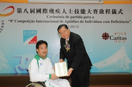 勞工事務局、社會工作局及澳門明愛於9月15日(星期四)下午4時,在勞工事務局職業培訓廳舉行「第八屆國際殘疾人士技能大賽」澳門代表團啟程儀式。勞工事務局孫家雄局長、社會工作局黃艷梅副局長、澳門明愛潘志明總幹事分別向15名選手頒發獎狀。主辦單位祝願代表團發揮水準,爭取獲得佳績,為澳門爭光。 首次參與國際殘疾人士技能大賽的澳門代表團一行33人,由勞工事務局副局長林美美、社會工作局副局長黃艷梅及澳門總幹事潘志明帶領,於9月25日至9月30日期間在韓國首爾參加「第八屆國際殘疾人士技能大賽」。而澳門選手將參加15個比賽項目,當中大部分屬高技能性項目,包括男服裁製、女服裁製、手工編織、鈎針編織、海報設計、英文電腦排版、英文文字處理、室外攝影、室內攝影、花藝、陶藝、繪畫、廢物再造、竹籃編織、電腦體育運動。 「第八屆國際殘疾人士技能大賽」15名參賽選手是從「第一屆澳門殘疾人士技能大賽」中選拔,再經過為期三個月的強化專業訓練,按照有關國際比賽的要求進行,使選手掌握並熟識國際比賽的評分要求及其他規則,為爭取優秀成績作好充分賽前準備。 「第八屆國際殘疾人士技能大賽」是特區政府首次組織本澳殘疾人士參與國際性職業技能比賽。參加國際職業技能大賽活動,使特區政府、本澳各社會服務團體、復康機構以及相關專業人士,加強與世界各地職業培訓機構的交流和合作、吸收最新的培訓經驗和技術,同時還能讓殘疾人士透過比賽展示才能,增強自信心和提升職業技能水平,有助他們獲得社會認同,開拓更廣闊的職業道路和更多的就業機會。 勞工事務局局長孫家雄表示,局方一直非常關注殘疾人士的就業及職業培訓的需要,為進一步使殘疾人士融入就業市場,就業廳顯能小組專責為殘疾人士提供就業配對服務,並且積極向社會各界推動聘僱殘疾人士計劃,同時,職業培訓廳亦與各社會服務團體緊密合作,為殘疾人士開辦職業培訓課程,以提升職業技能及就業能力。 「第八屆國際殘疾人士技能大賽」澳門代表團能夠成功組織,全賴各協辦單位的支持及協助,包括澳門理工學院、澳門生產力暨科技轉移中心、澳門弱智人士家長協進會、澳門弱智人士服務協會、澳門特殊奧運會、澳門扶康會、澳門利民會、協同特殊教育學校、澳門聾人協會、澳門聽障人士協進會、澳門仁慈堂盲人重建中心、中國澳門殘疾人奧委會暨傷殘人士文娛暨體育總會、澳門傷殘人士服務協進會及各位培訓導師。 出席是次啟程儀式的嘉賓還包括澳門生產力暨科技轉移中心關治平高級經理、澳門弱智人士服務協會代鎮亞副經理、澳門扶康會陳才發理事會主席、澳門利民會蘇景揚總幹事、協同特殊教育學校林劍如校長、澳門聽障人士協進會黃錦鳯理事會成員、澳門仁慈堂盲人重建中心梁雪梅主任、澳門傷殘人士服務協進會吳惠民會長等多位協辦單位負責人。