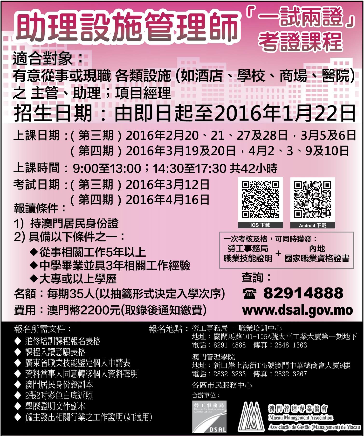 設施管理考證課程是由廣東省職業技能鑒定指導中心、廣州市白雲工商技師學院、勞工事務局和澳門管理專業協會共同開發,首階段推出的助理設施管理師「一試兩證」考證課程,以「一試兩證」模式進行,完成培訓的學員將獲安排參加測試,通過者可獲本澳的職業資格證明及國家職業資格證書。在此基礎上,會再以「一試三證」模式推出更高技能級別的設施管理師和高級設施管理師的測試。