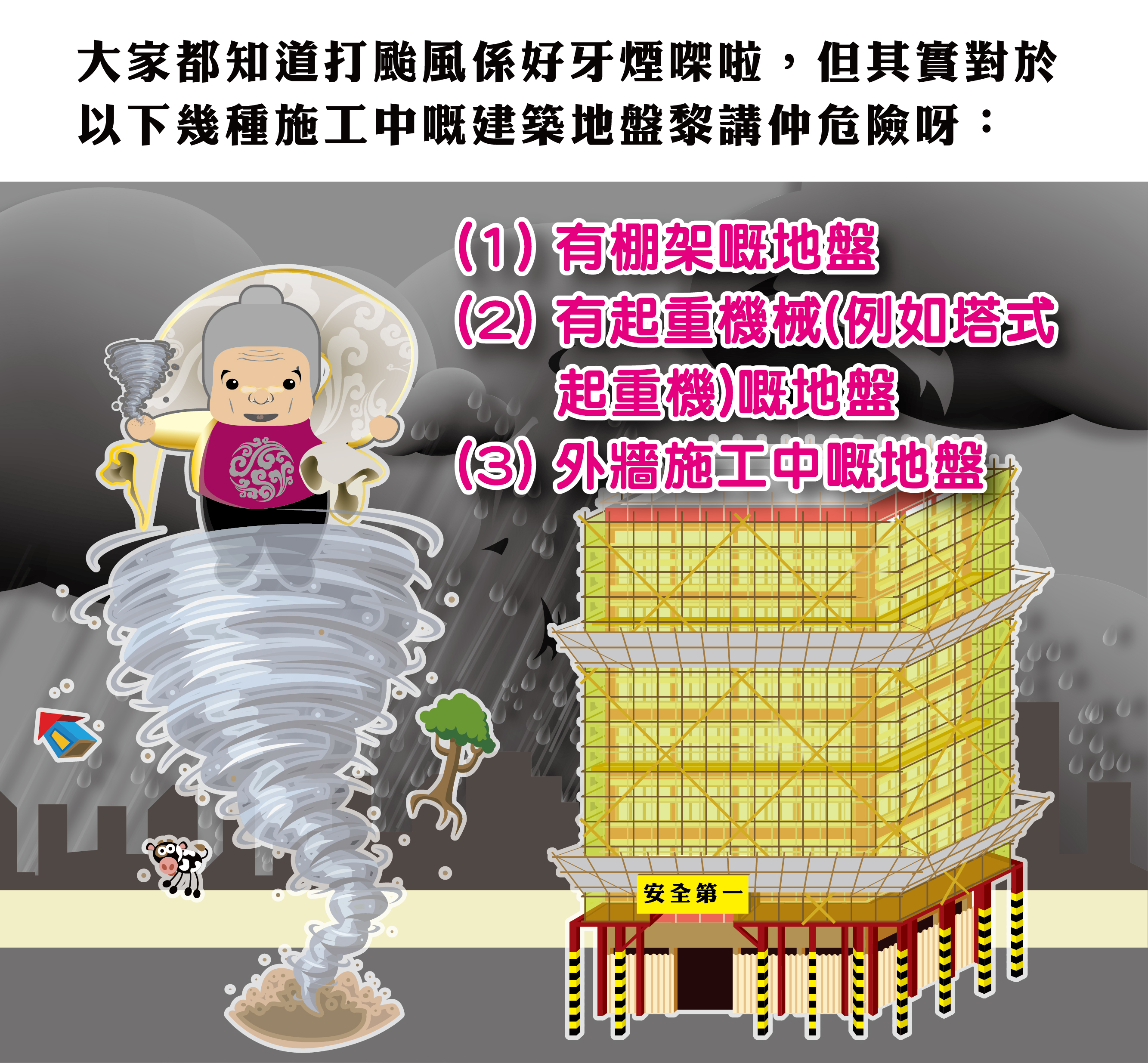 風婆婆:「係呀,特別係收到ORDER要放颱風時,我都好驚吹冧D野整親你地!特別係建築工地!一於等我教埋你地,颱風季節期間建築工地安全大法!」