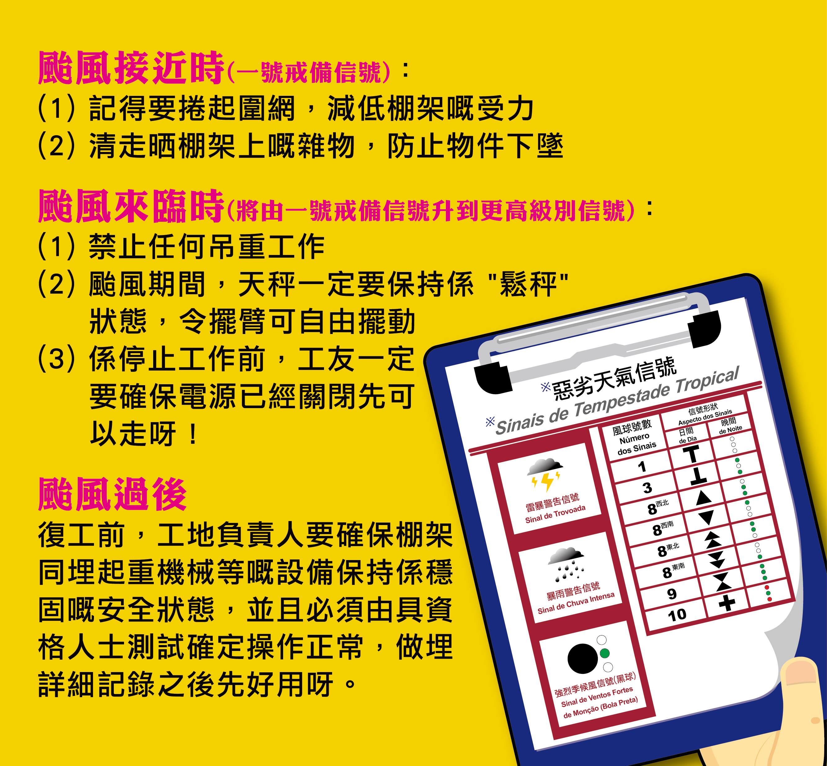 想知多D颱風季節期間點做好個建築工地安全,你可以去勞工事務局www.dsal.gov.mo職安健天地了解下。我之前已經放左好多安全錦囊係佢地度架啦!」