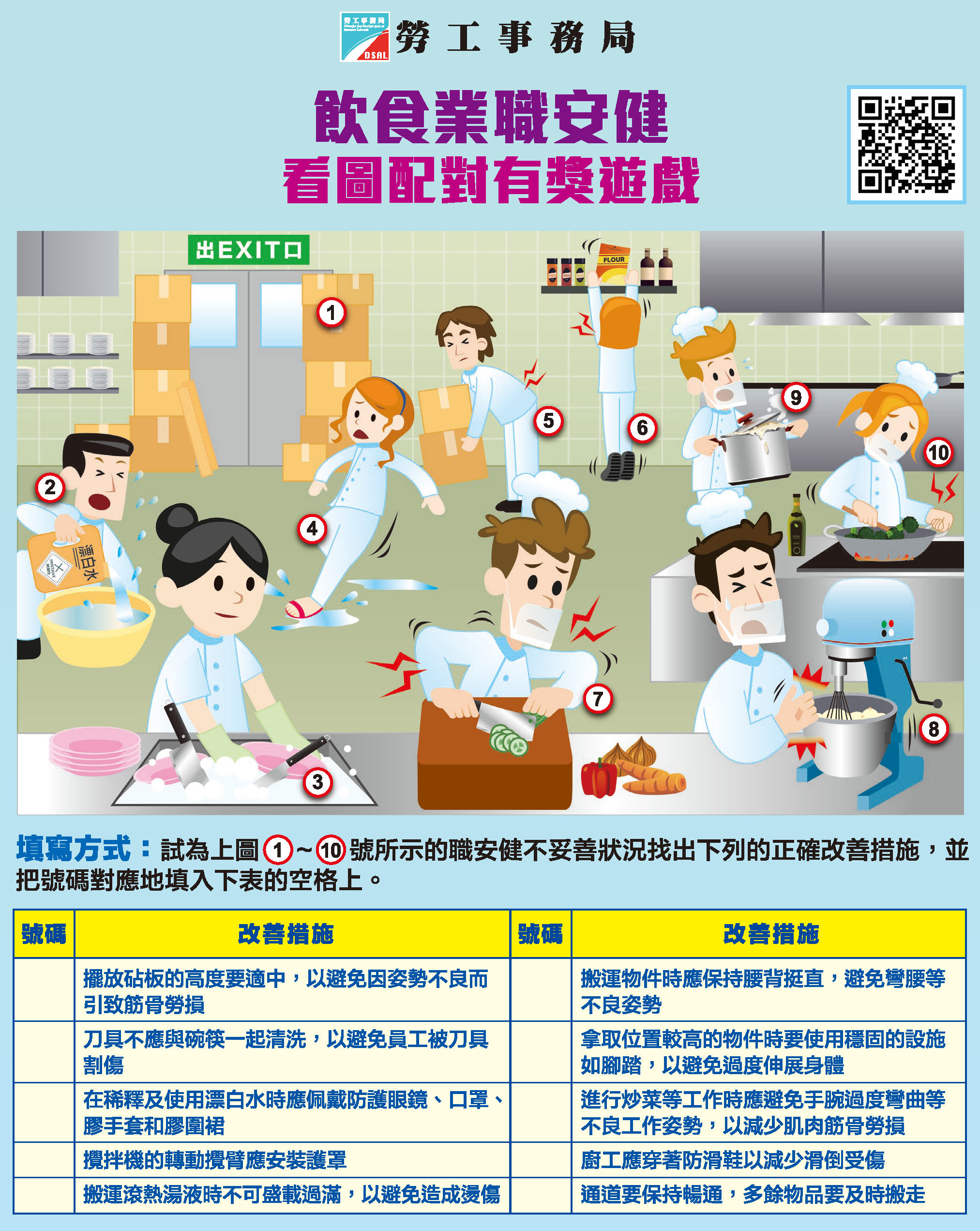 為持續提升飲食業從業員的職業安全健康意識,勞工事務局正舉辦一系列飲食業職安健宣傳推廣活動,包括「第二屆飲食業職安健獎勵計劃」活動、「飲食業專題講座」及「飲食業職安健看圖配對有獎遊戲」,希望藉著系列活動,向飲食業從業員普及飲食業職安健的基本知識,鼓勵業界採取安全的工作模式,培育良好的安全文化和管理制度。