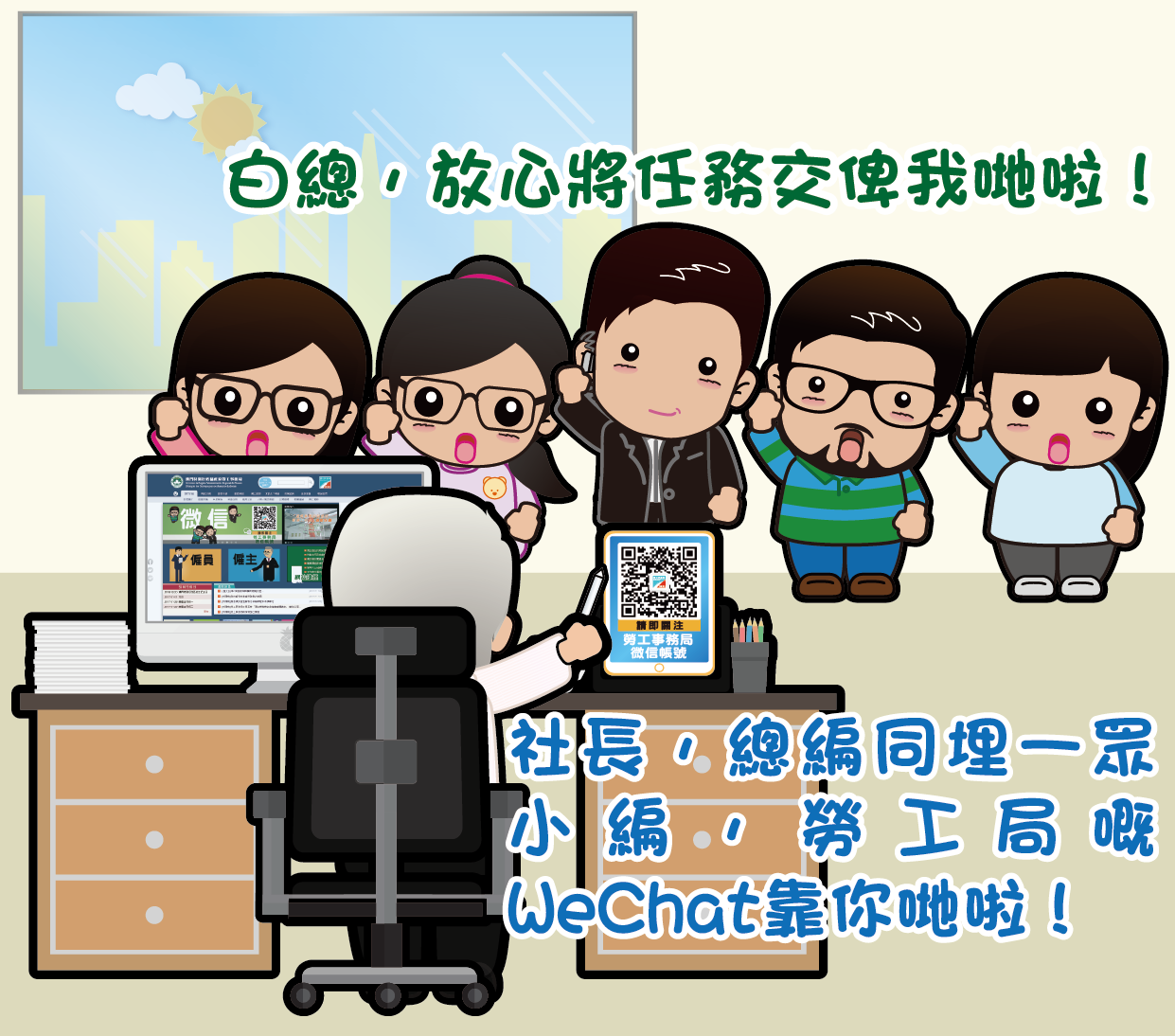 白董事長:小編們,勞工局嘅WeChat靠你哋啦 !你哋要好好宣傳局方資訊,等多D市民了解自身權益同保障呀!為人民服務!