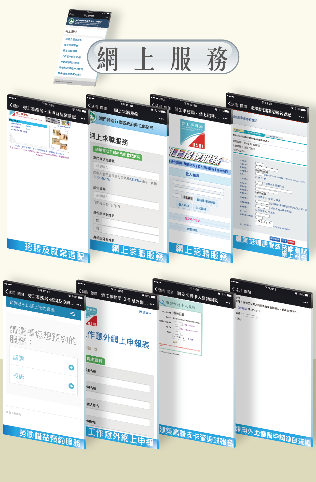 網上服務包括:招聘及就業選配、網上求職及招聘服務、工作意外網上申報、勞動權益預約服務、職業培訓課程或技能測試網上報名、建築業職安卡查詢或報名以及聘用外地僱員申請進度查詢等。