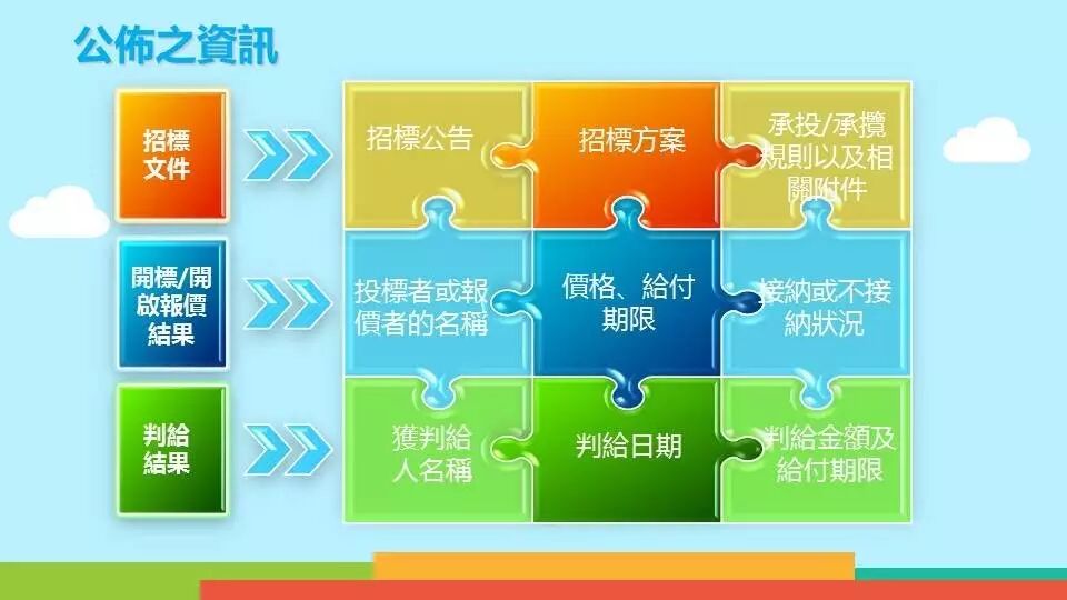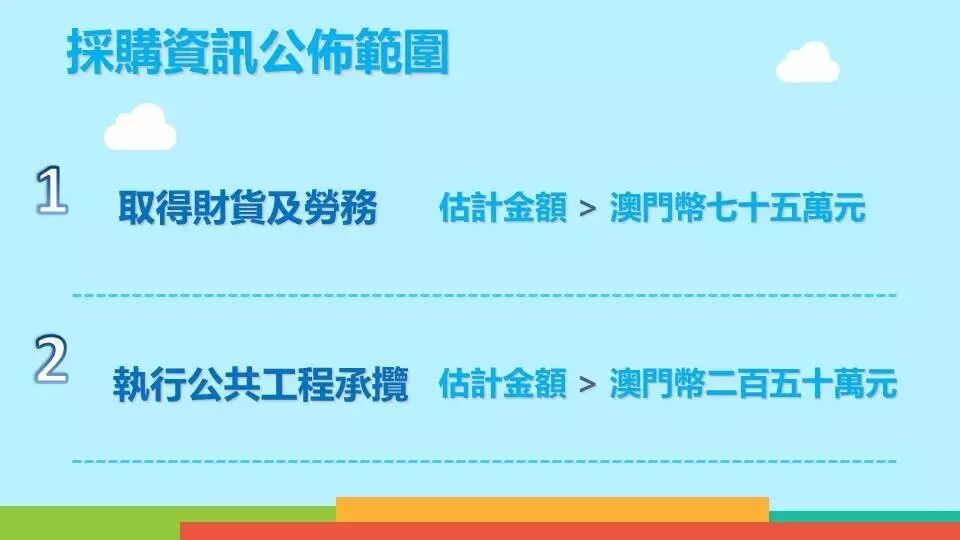 有關招標文件,尤其是招標公告、招標方案、承投/承攬規則及其相關附件等資訊,須在招標公告刊登於《澳門特別行政區公報》的同一日公佈;開標/開啟報價結果,包括全部投標者或報價者的名稱、價格、給付期限以及接納或不接納狀況等,須於開啟投標書或報價文件之日起計三十日內公佈;至於判給結果,包括獲判給人的名稱、判給日期、判給金額以及給付期限等,則須於收到具權限實體許可批示判給建議書後三十日内公佈。