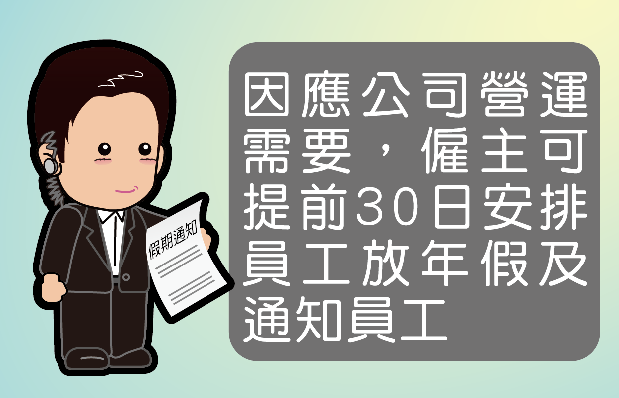 當然啦,老闆都可以因應公司嘅營運需要而安排員工放年假! 但就需要提前30日訂好日子同埋通知員工。