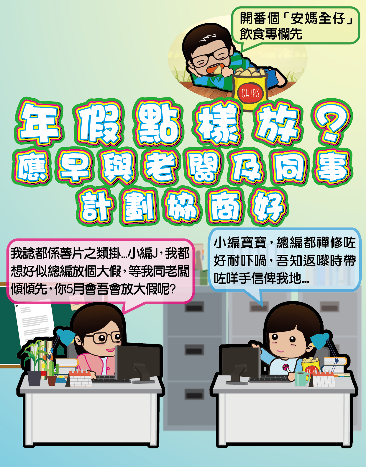 按照勞工法,打工仔工作滿一年就可以有至少6個工作日嘅有薪年假架啦。但係聽到可以放假都唔好咁興奮住,作為一個負責任嘅員工,想放假就一定要預先同老闆溝通清楚,得到老闆嘅批准至可以放,唔好就甘"飛"左去啊!