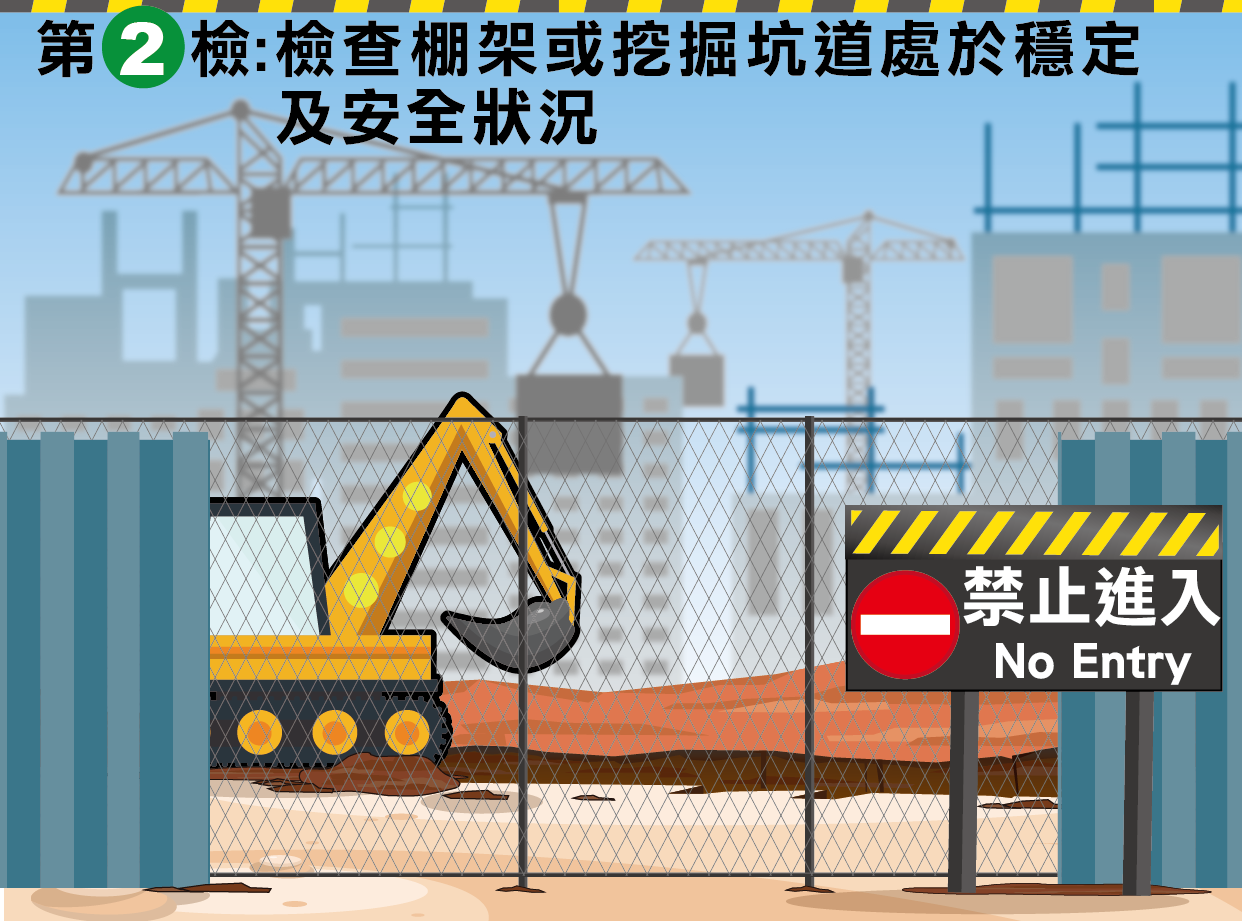 打卡前第二檢:檢查棚架或挖掘坑道以確保其處於穩定及安全狀況,如假期前未能完成改善工序,並且情況不會造成即時危險,則須設置適當圍封及警告牌,防止其他人士進入;