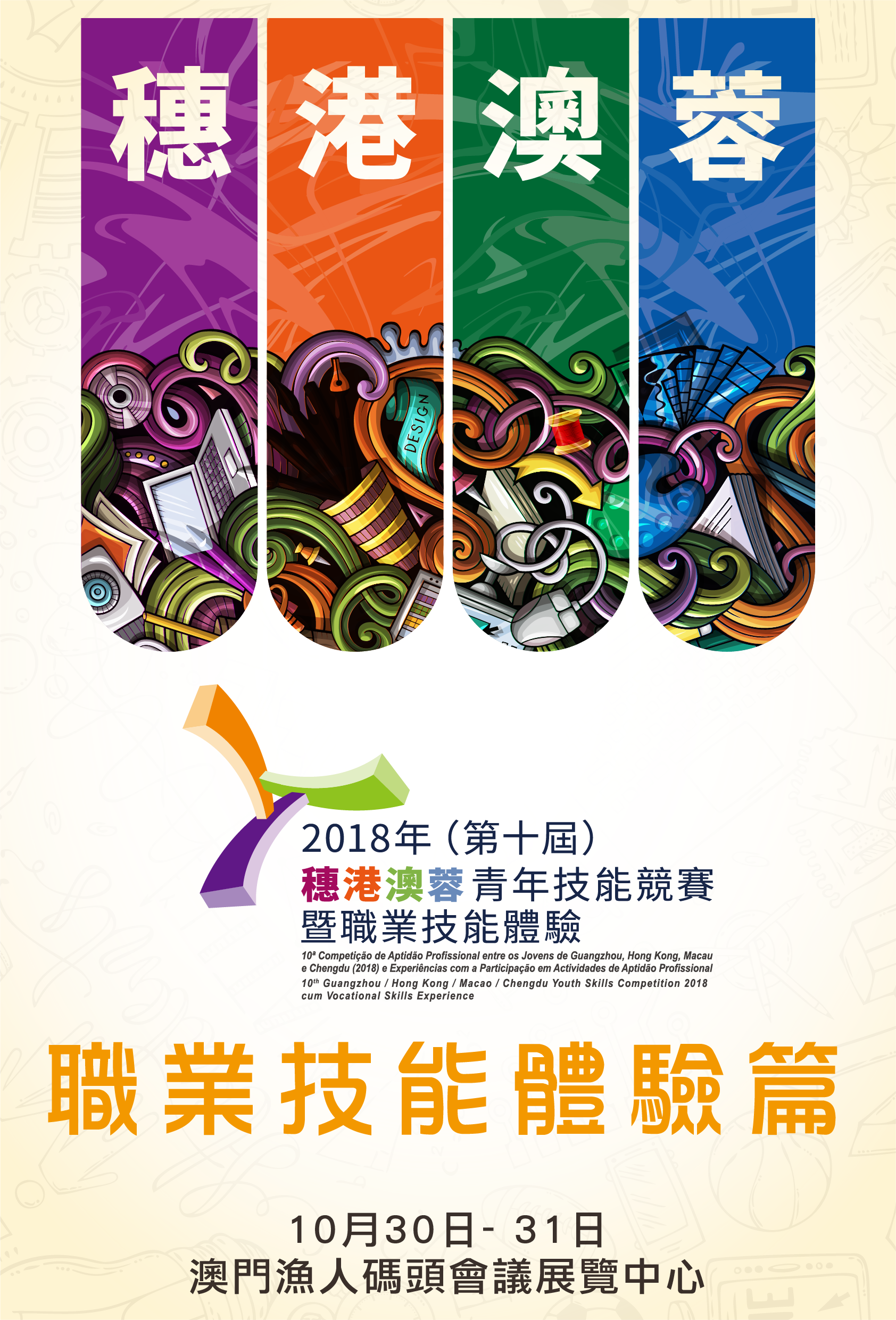 「2018 年( 第十屆) 穗港澳蓉青年技能競賽暨職業技能體驗」除了五項精彩技能競賽外,本屆更加入了多項展示及演示項目,當中邀請了廣州、香港及成都人員特地來澳為參觀人士呈現富有當地特色之展示及演示項目,包括蜀繡、茶藝、剪紙互動體驗及VR 棒球遊戲等精彩內容。除此之外,為呈現澳門融合中葡文化特色,將邀請入場人士一同製作中式餐點及澳葡式食品,或可於現場動手製作手繪環保袋及製作鮮花花束等,另外,同場亦會展示澳門造船工藝成品模型及WER機械人友誼賽,務求讓參觀人士目不暇給及滿載而歸。