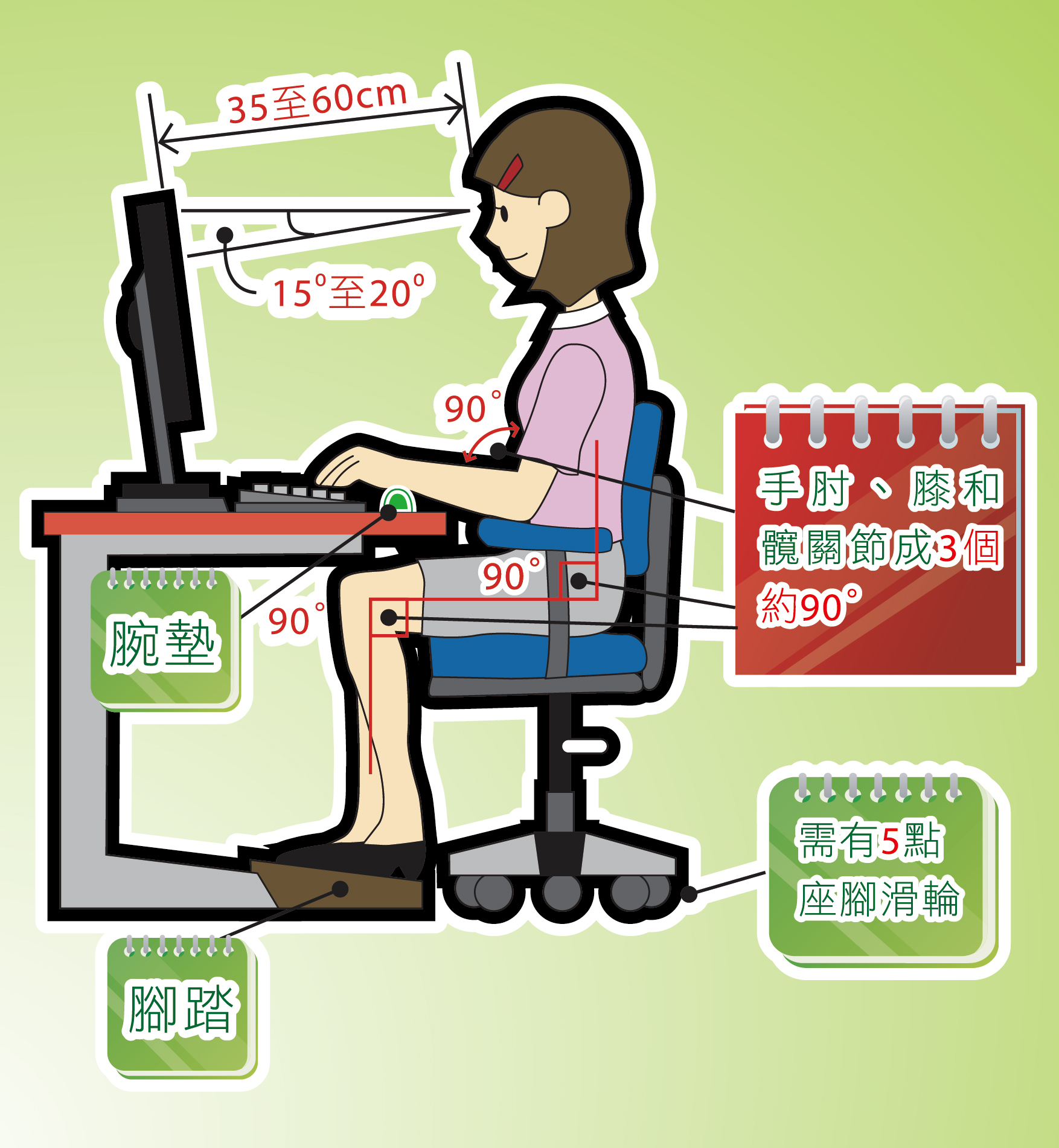 1. 保持正確的姿勢,例如使用電腦時,坐姿要保持3個90度,避免頭部前傾,減少頸部與背部疼痛。