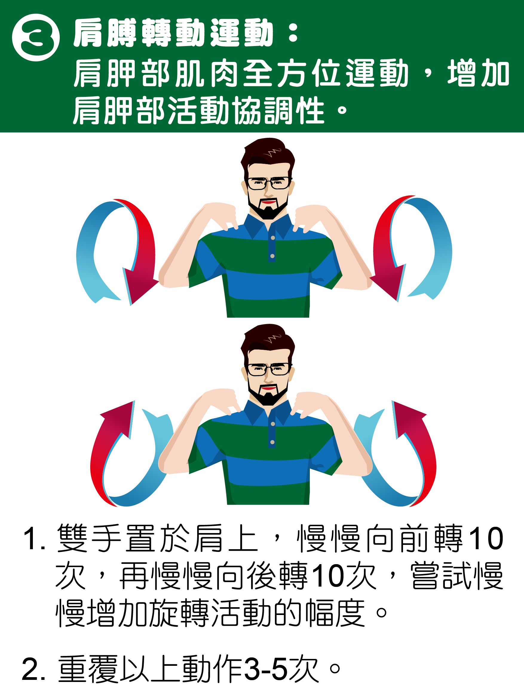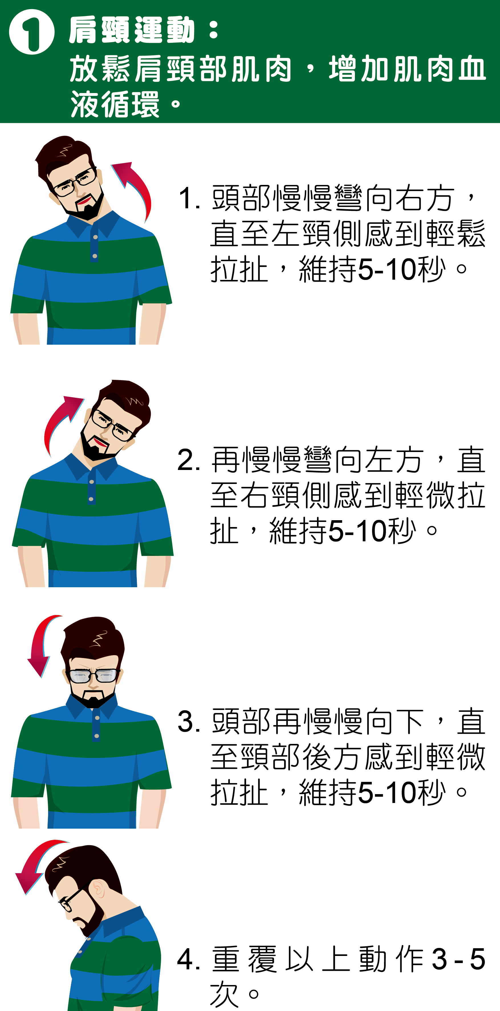 3. 適度進行肩頸部舒展運動,可以改善血液循環,避免過久不動而導致肌肉僵硬。