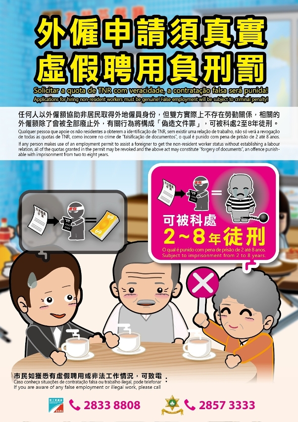 就司法警察局發現有商戶涉嫌觸犯偽造文件罪,以及外地僱員許可被不規則使用的情況,勞工事務局表示高度關注並在此重申,外地僱員僅是用作補充本地人力資源的不足,申請聘用外地僱員的資料須真實,勿作虛假申報及提供虛假資料。