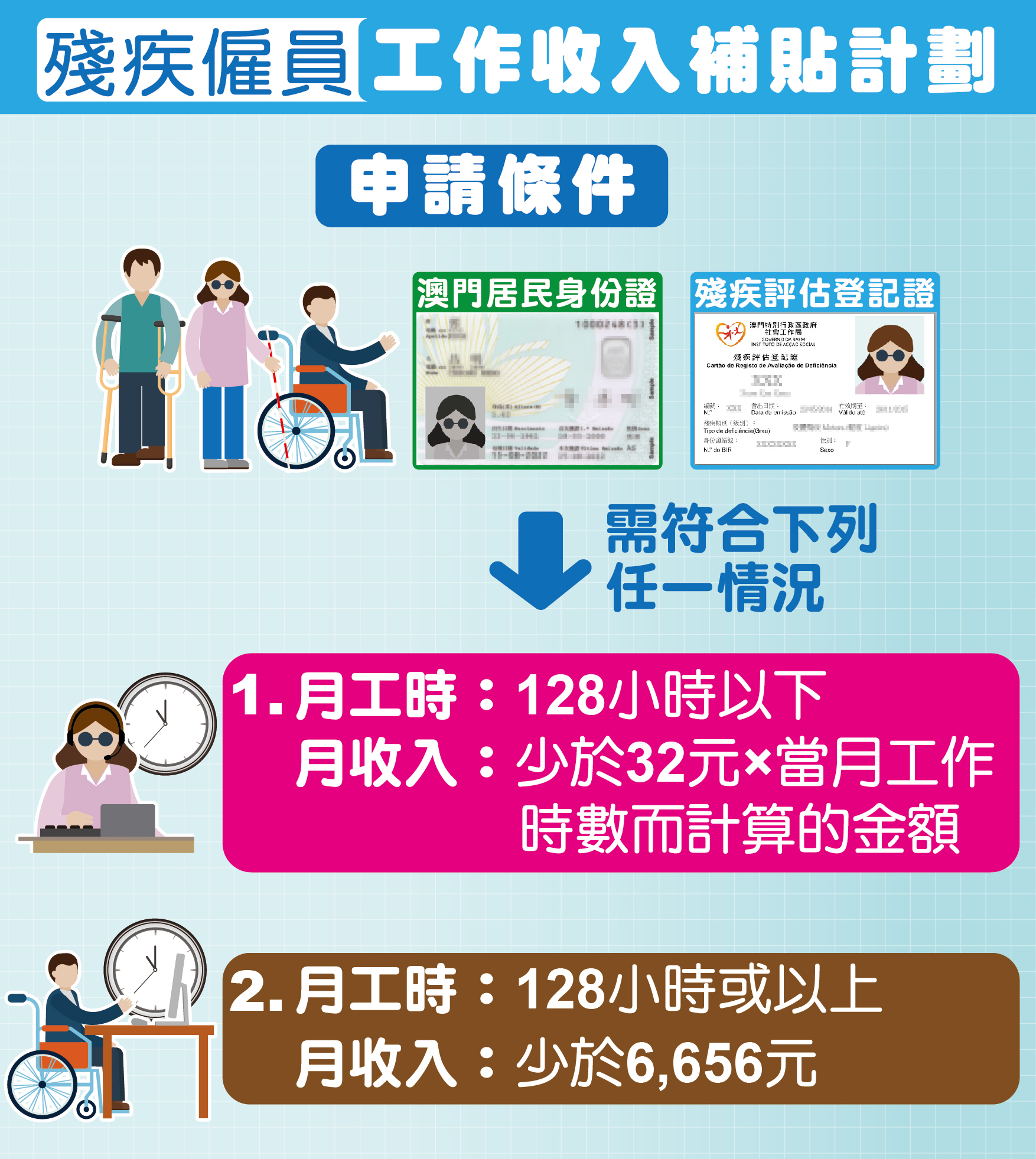 凡持有由社會工作局發出有效的殘疾評估登記證的本地僱員,如按月累計工作總時數少於128小時,且當月工作收入少於《僱員的最低工資》規定的每小時最低工資金額32澳門元乘以當月實際提供工作時數而計算的金額;又或符合按月累計工作總時數等於或多於128小時,且當月工作收入少於《僱員的最低工資》規定的每月最低工資金額6,656澳門元,均可作出申請。