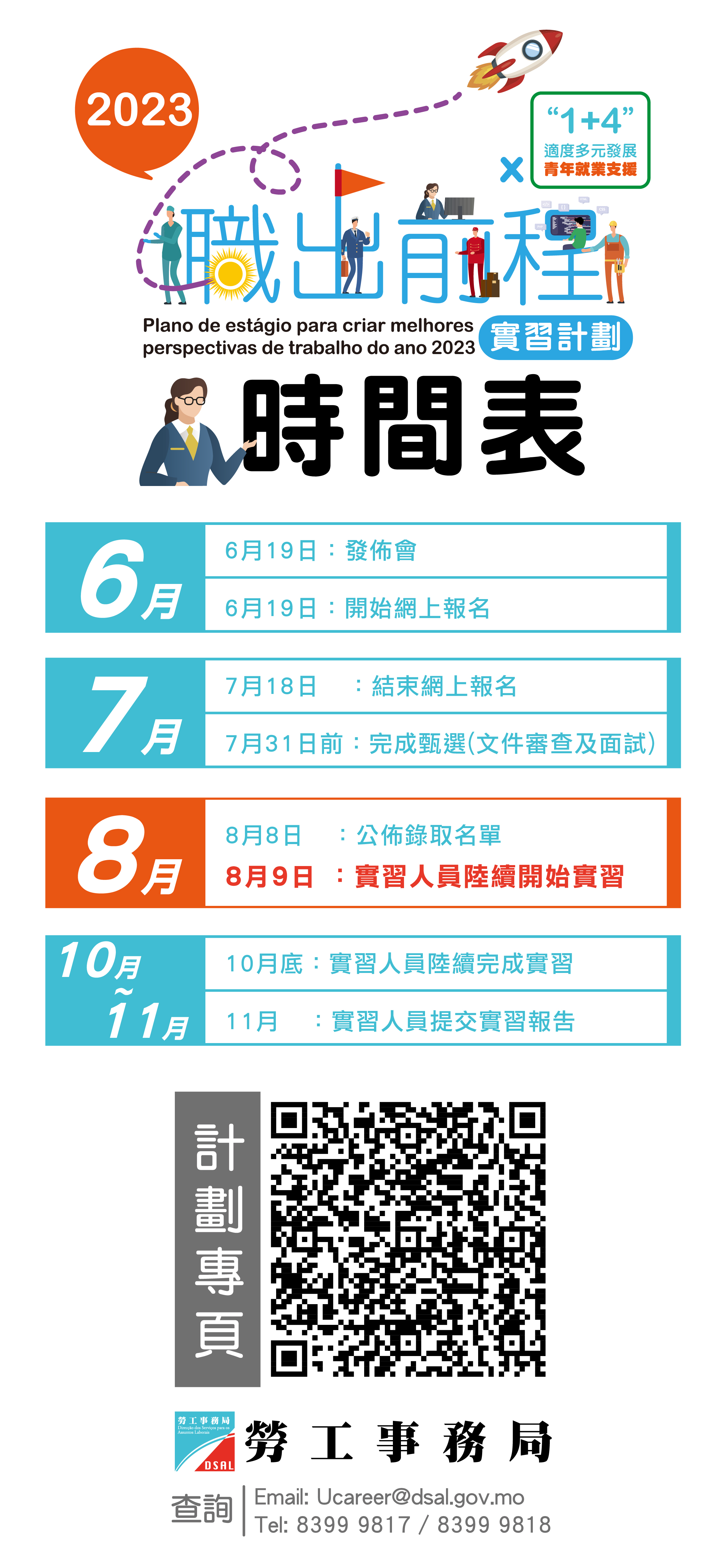 勞工事務局一直關注青年的就業情況,今年繼續推出“職出前程實習計劃”,計劃旨在協助青年做好就業前準備,讓大學畢業青年通過3個月職場歷練,從中積累經驗、逐步成長並達至提升業務能力。同時,為配合特區政府“1+4”經濟適度多元發展策略,今年計劃圍繞促進旅遊休閒業多元發展,逐步擴大行業範圍,並推動更多與四大產業相關的企業參與。計劃申請期至2023年7月18日,有興趣參加計劃的澳門青年把握機會盡早申請。