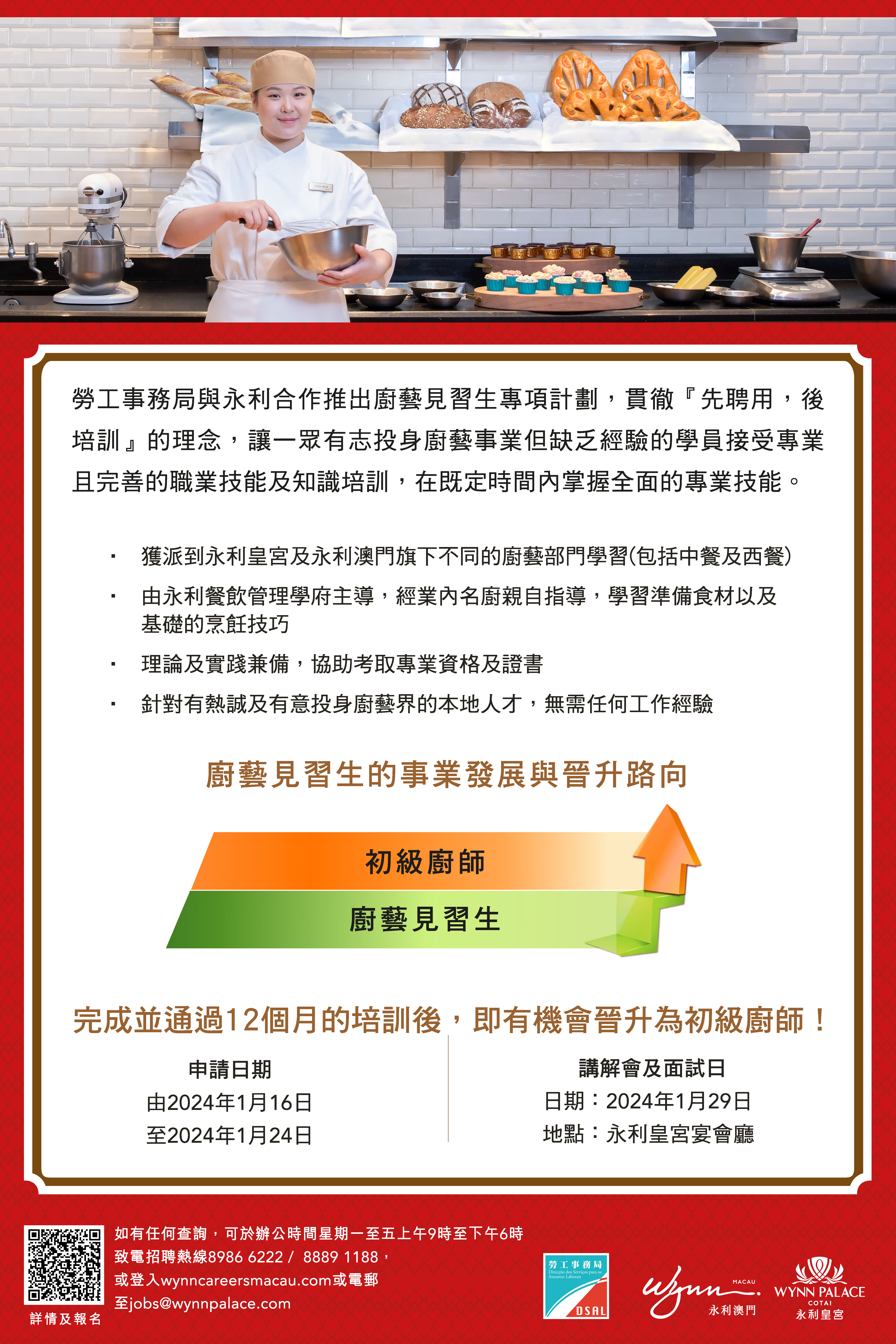 勞工事務局與永利澳門有限公司(下稱“永利澳門")合作推出“永利廚藝見習生專項計劃"(下稱“計劃”),以“先入職、後培訓"方式,培育有意投身廚藝事業但缺乏相關經驗的澳門居民,並提供專業及全方位培訓,藉此協助澳門居民發展職涯和推動向上流動。計劃由1月16日起接受申請。