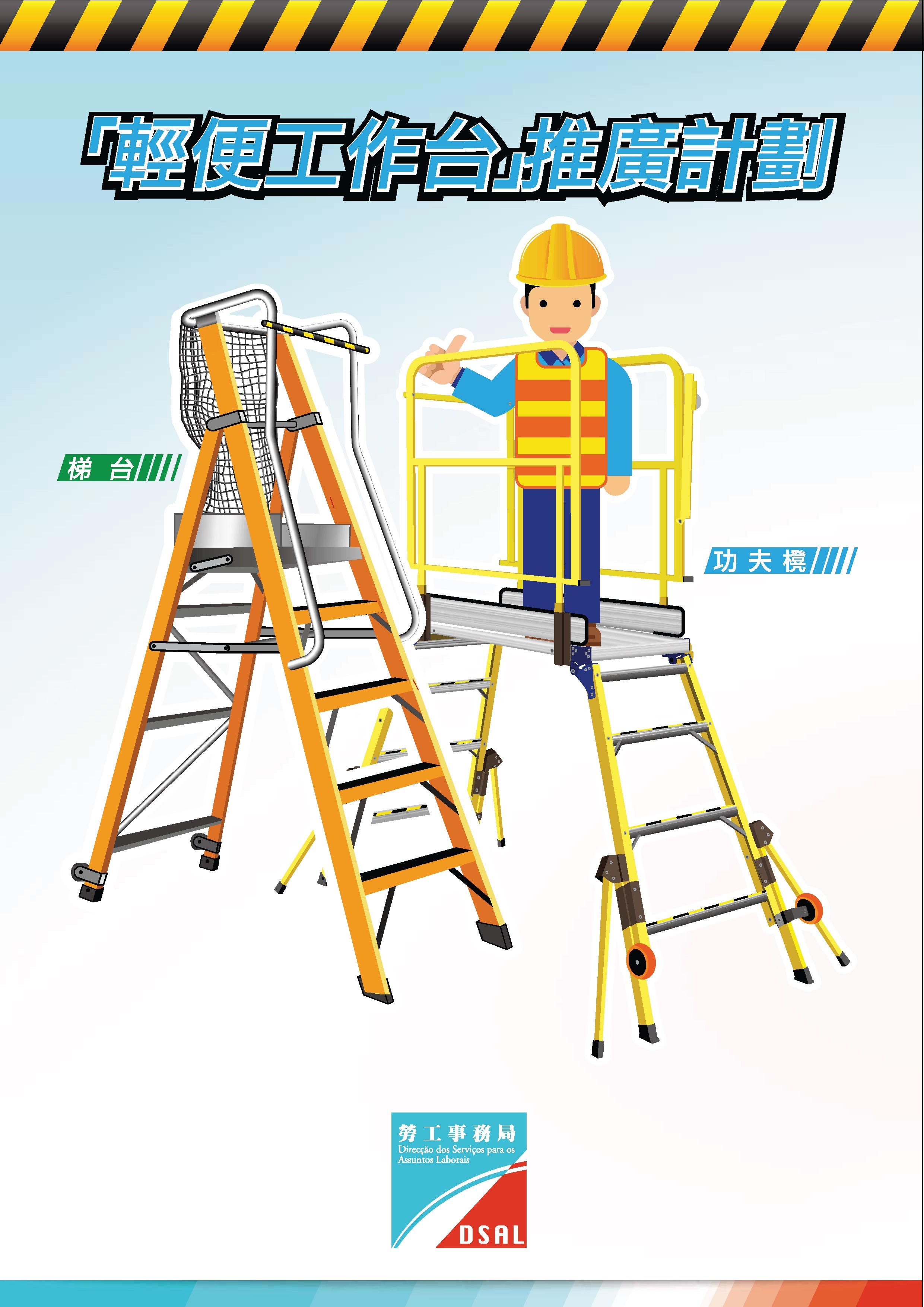 勞工局並製作了多款針對不同工種人員的宣傳物品和參考資料,包括人體下墮意外案例篇及預防中暑主題相關海報等。詳情可致電28717781、親臨勞工局索取或瀏覽勞工局「職安健天地」專題網頁(https://www.dsal.gov.mo/dsso/zh_tw/standard/index.html)。