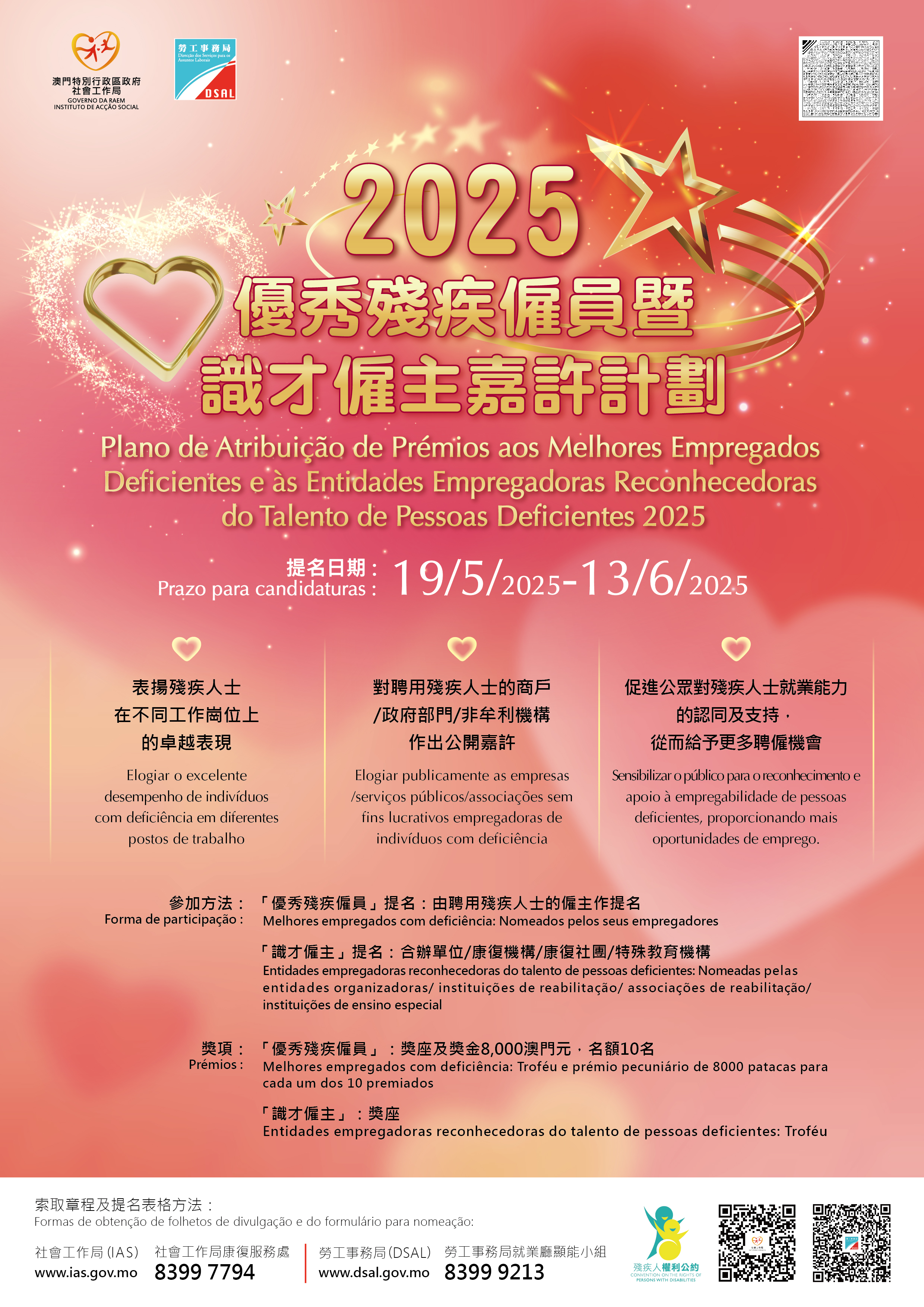 為表揚本澳在不同工作崗位上有傑出表現的殘疾人士,並公開嘉許聘用殘疾人士的商戶、政府部門或非牟利機構,以促進公眾對殘疾人士就業能力的了解及接納,給予殘疾人士更多就業機會,協助他們融入社會,勞工事務局與社會工作局合辦“2025優秀殘疾僱員暨識才僱主嘉許計劃”,將於5月19日至6月13日接受提名。