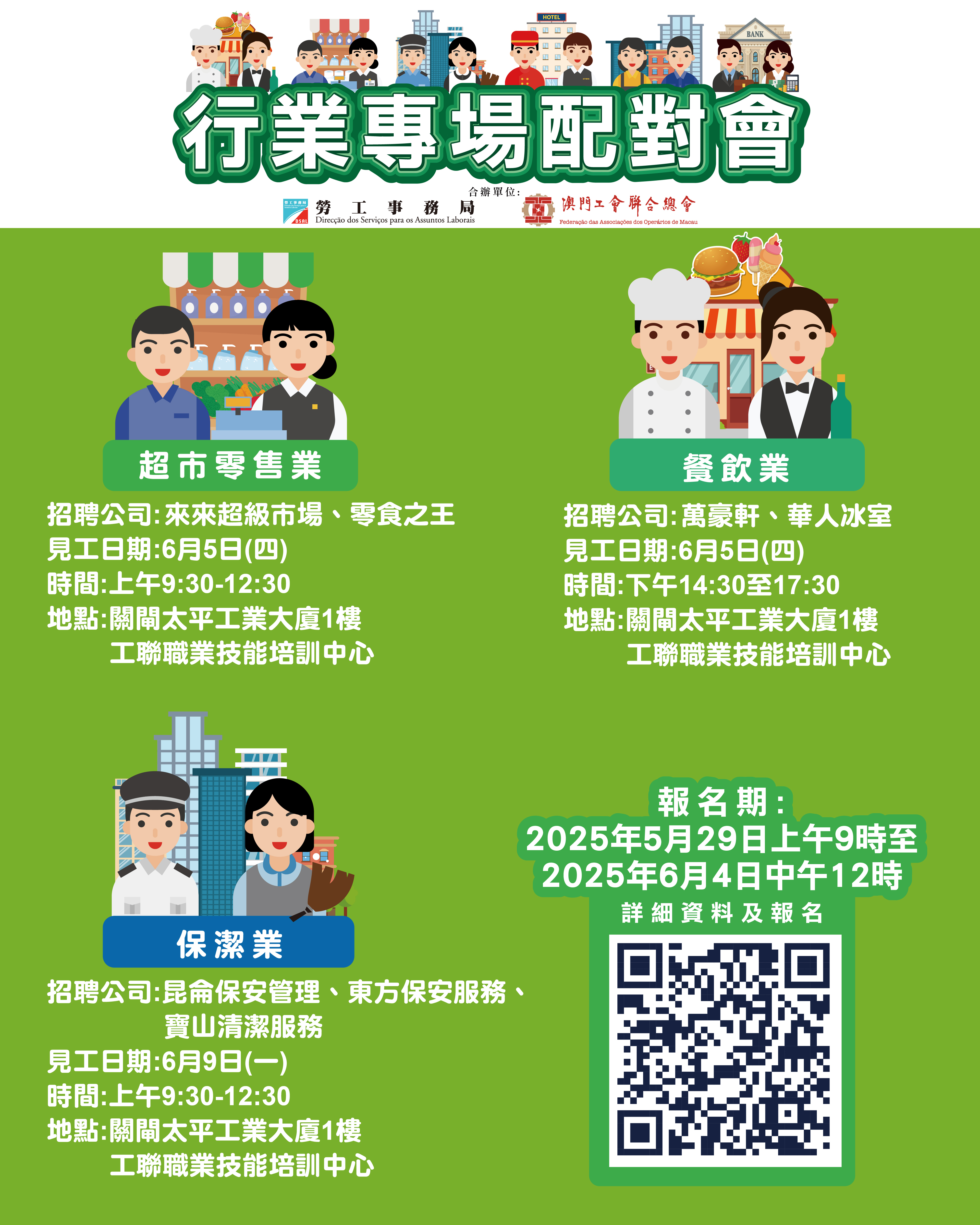 6月5日上午超市零售業專場配對會、6月5日下午餐飲業專場配對會及6月9日上午保潔業專場配對會均在澳門工聯職業技能培訓中心(關閘馬路101-105A號太平工業大廈第一期1樓)舉行。報名日期為5月29日上午9時至6月4日中午12時。