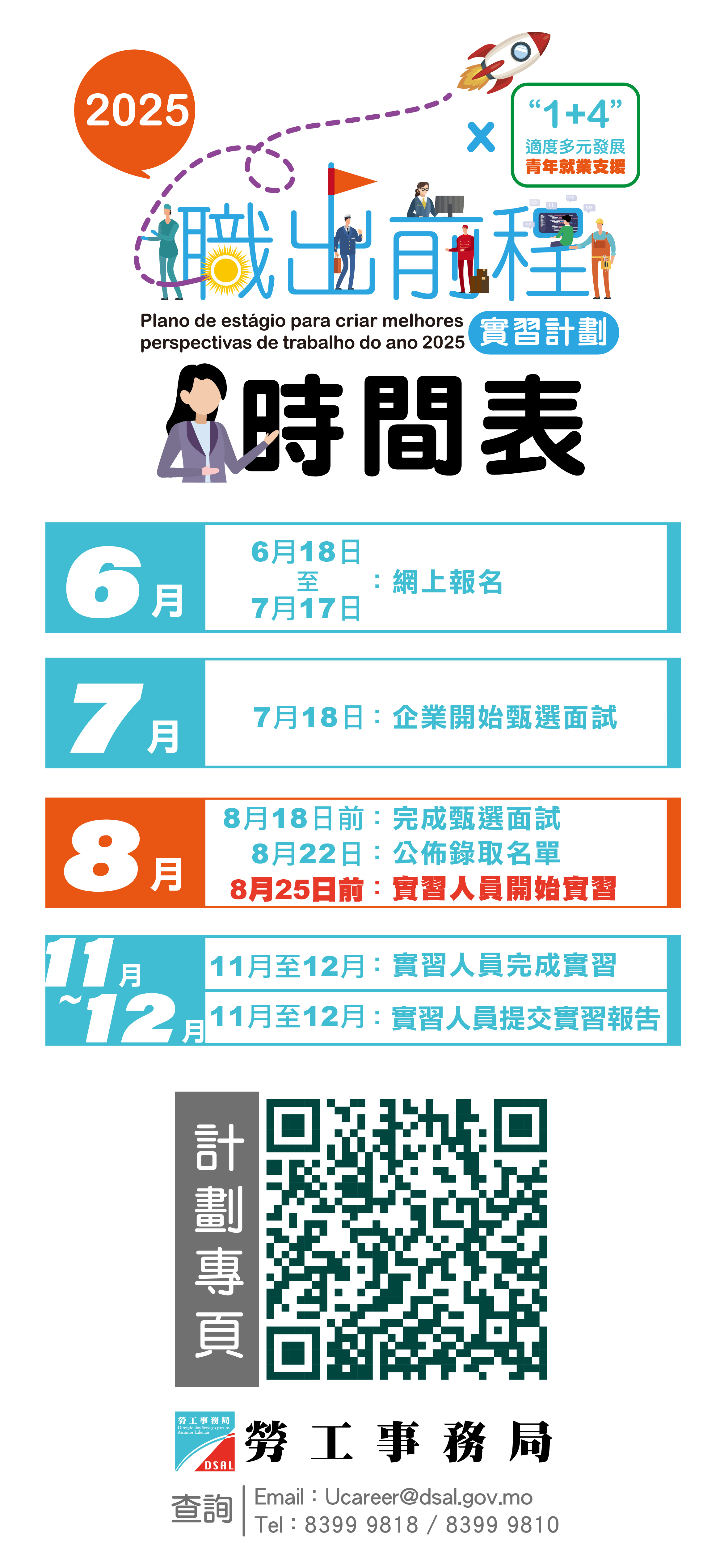 如欲了解計劃詳情可瀏覽“職出前程實習計劃2025”專頁https://www.dsal.gov.mo/zh_tw/standard/employment_recruitment_local_intern_2025.html,或於辦公時間內致電李先生83999818或陳小姐83999810查詢。