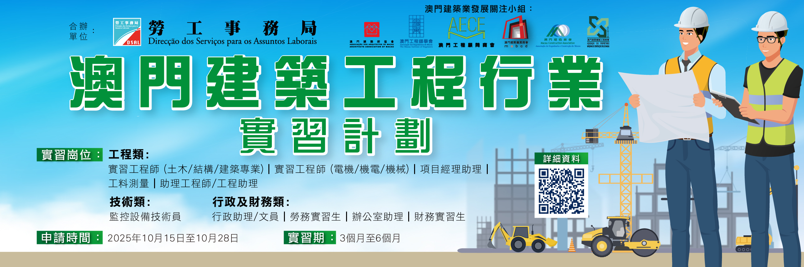 為培育澳門青年投身建築與工程行業,以促進本地人才梯隊的建設和可持續發展,勞工事務局聯同由澳門建築師協會、澳門建築置業商會、澳門工程師學會、澳門工程顧問商會、澳門建造商會及澳門建築機械工程商會組成的“澳門建築業發展關注小組”合作,推出“澳門建築工程行業實習計劃”(下稱“計劃”),該計劃於10月15日至28日接受網上申請,實習名額有限,有意參加計劃的澳門青年申請從速。