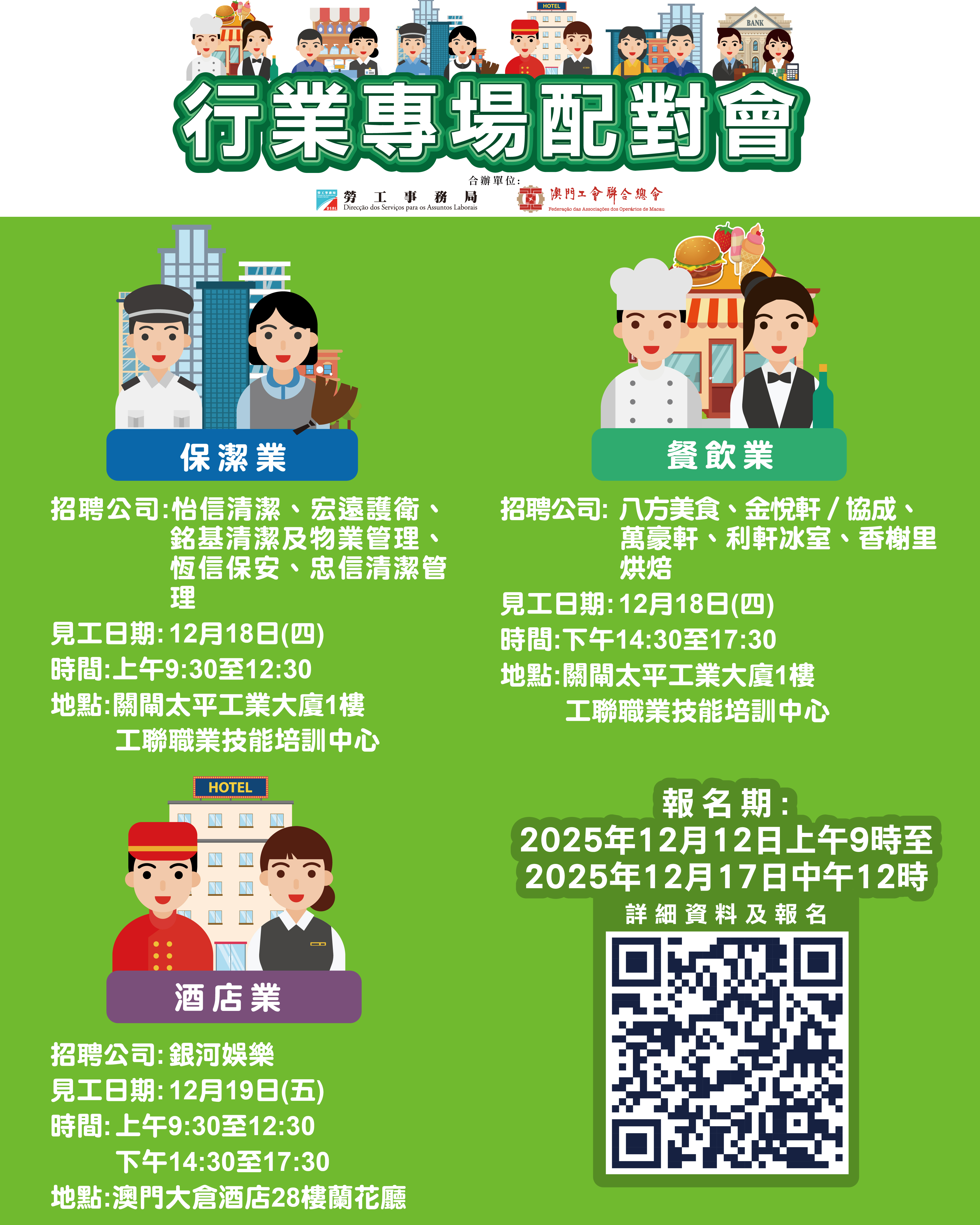12月18日上午保潔業專場配對會及12月18日下午餐飲業專場配對會,均在澳門關閘馬路101-105A號太平工業大廈第一期1樓的工聯職業技能培訓中心舉行;12月19日全日酒店業專場配對會在澳門大倉酒店28樓蘭花廳舉行。報名日期均由明(12)日上午9時起至12月17日中午12時。