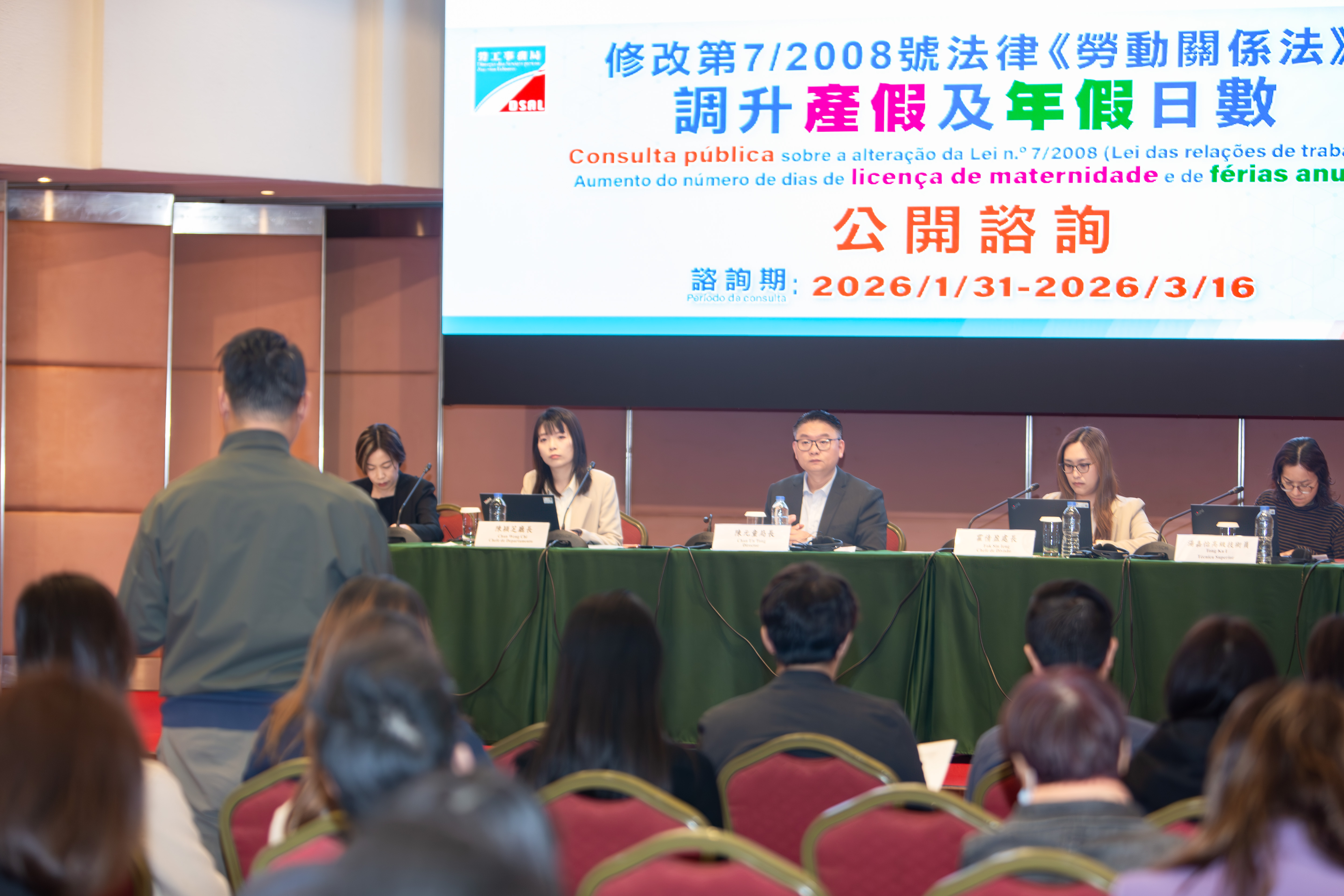 修改第7/2008號法律《勞動關係法》關於調升產假及年假日數的公眾諮詢期將於3月16日結束。勞工事務局(下稱“勞工局”)已於3月7日舉行了第三場公眾諮詢會,當日出席人數約70人,廣泛聽取社會各界對是次修法的意見和建議,並進行充分交流。